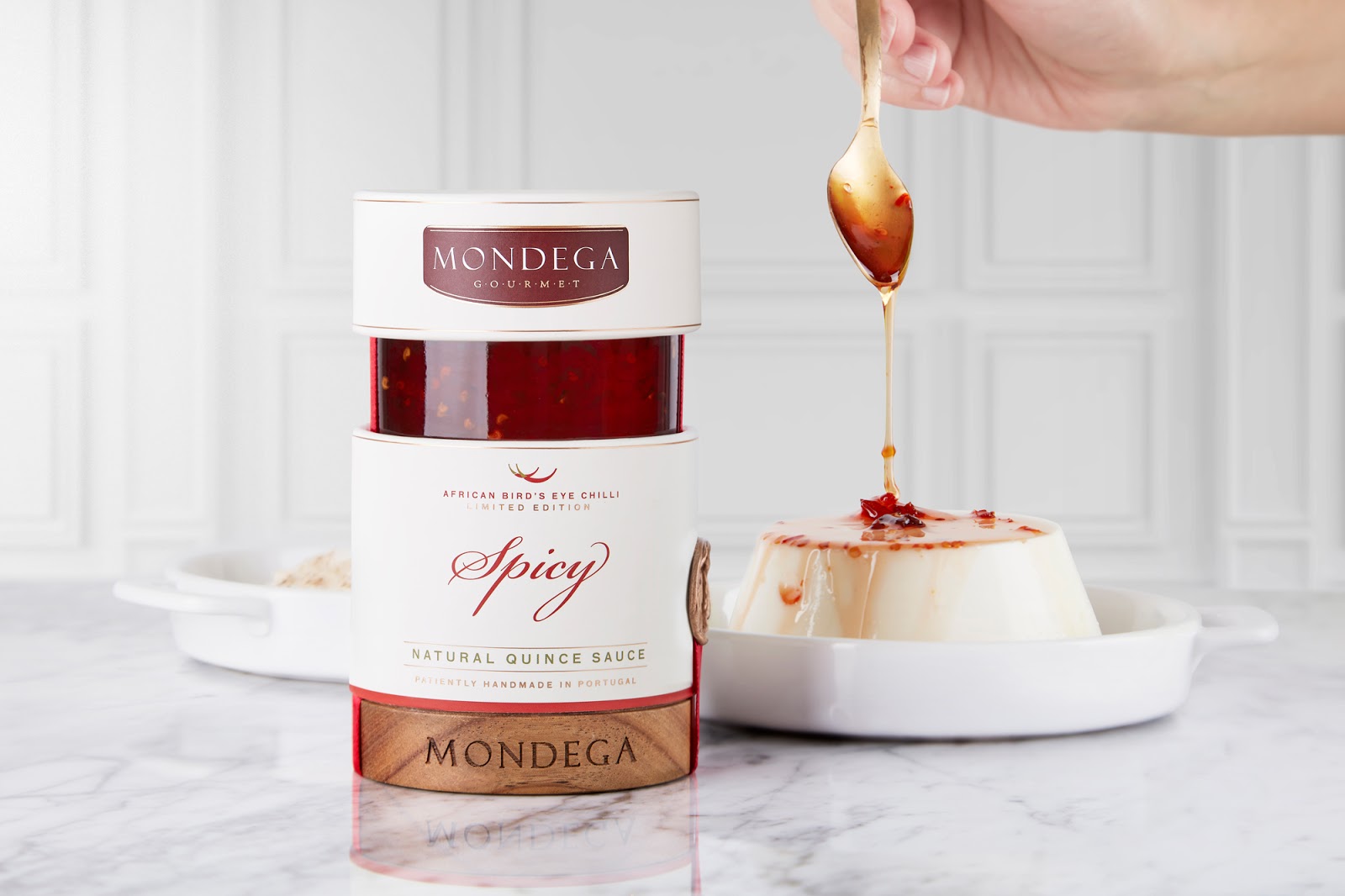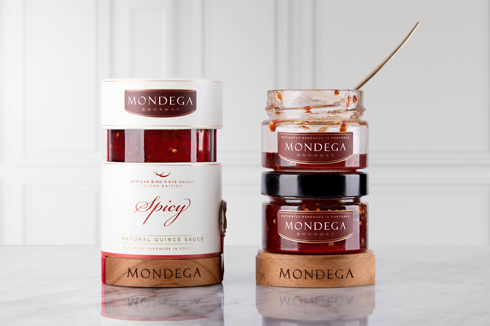 限量生產(chǎn)的 Mondega Gourmet - Natural Spicy Quince Sauce 是一種手工制作的辣醬。此版本采用精心挑選的天然產(chǎn)品制成,采用代代相傳的配方。Mondega Gourmet 要求我們創(chuàng)造一種適合世界各地任何商店櫥窗的包裝。永恒的設(shè)計(jì)優(yōu)雅,專注于高端市場。