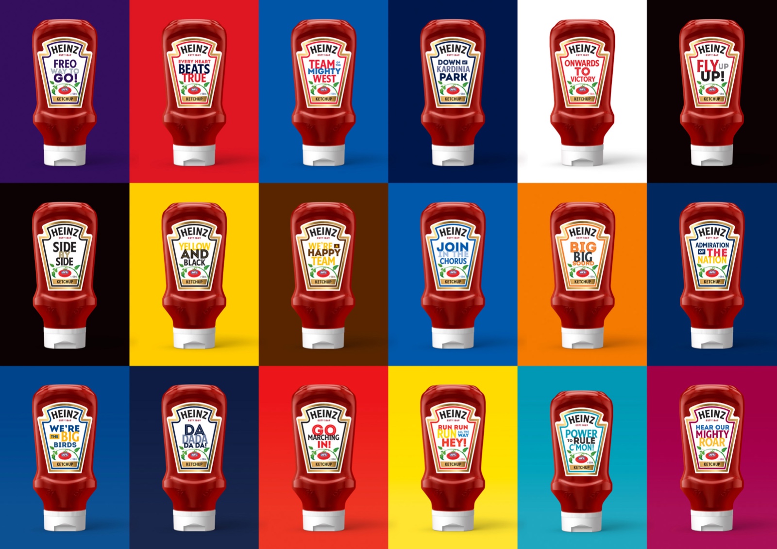 結(jié)果,亨氏番茄醬和AFL的大膽排版表達(dá)創(chuàng)造了一個(gè)真正的收藏系列,每個(gè)包裝上都有每個(gè)熱情粉絲的聲音放大。