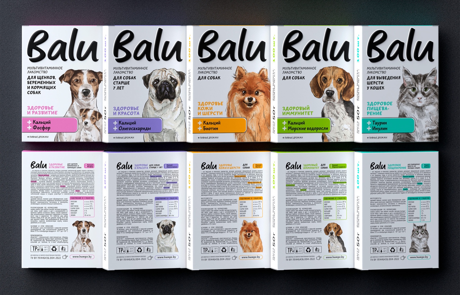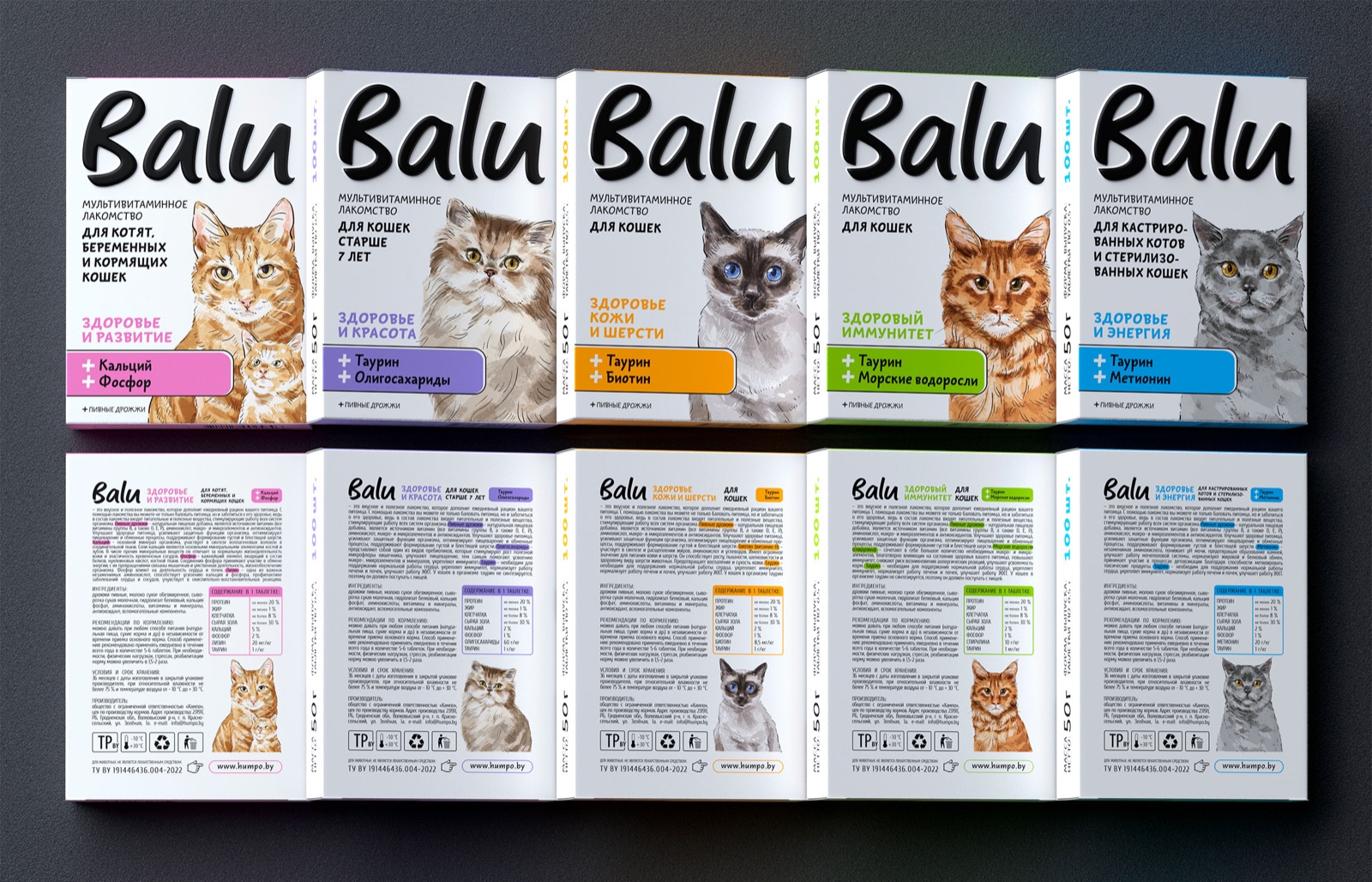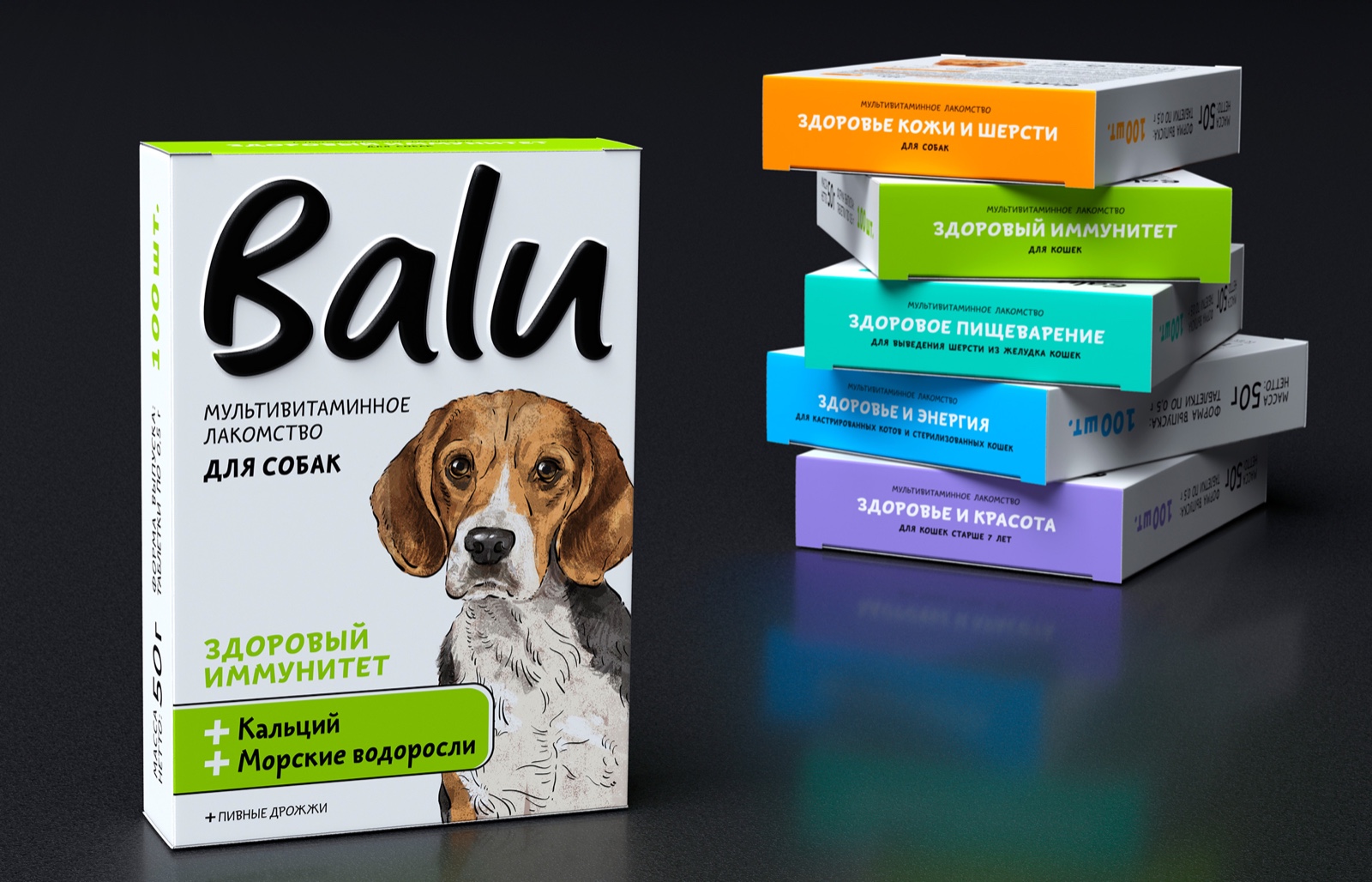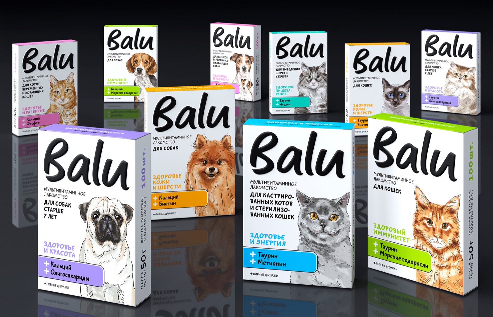 TM Balu系列補充了一種新的流行產品——一種復合維生素佳肴,旨在增強寵物的免疫系統(tǒng)和健康。它不是藥物,被用作動物食品的添加劑。所產生的維生素復合物以片劑的形式生產,并包裝在單獨的紙箱中。該系列包括四種狗用產品和六種貓用產品。