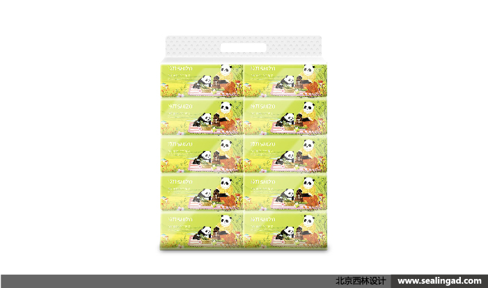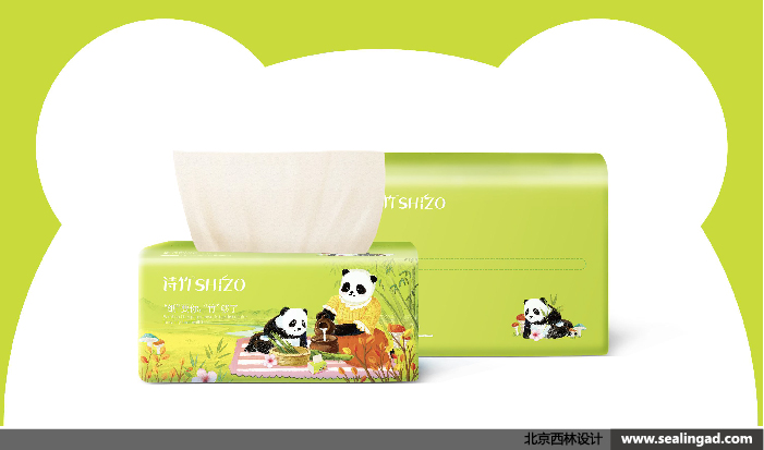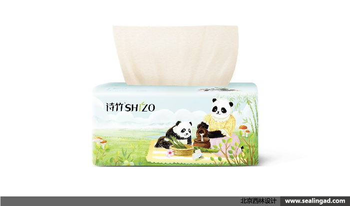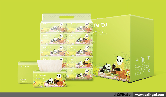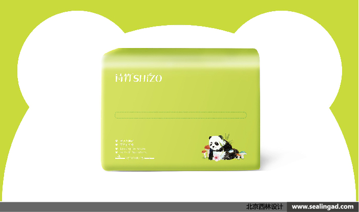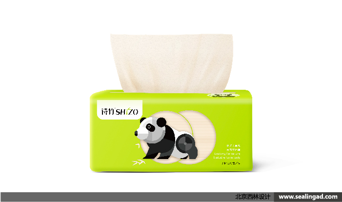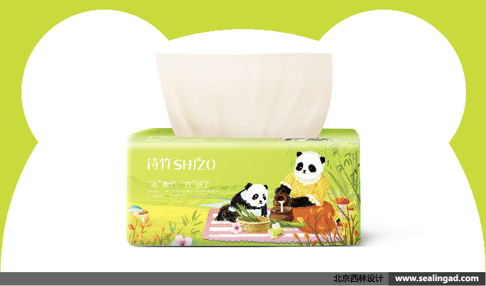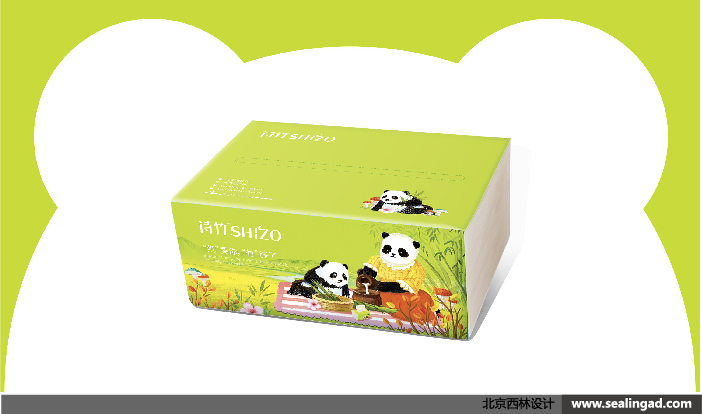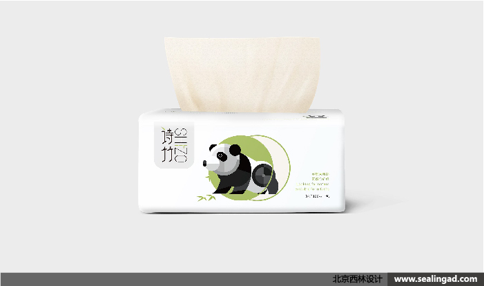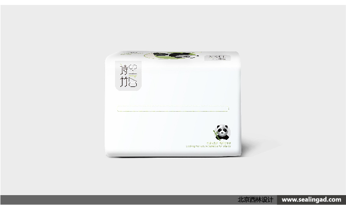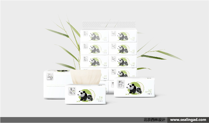 此方案簡約幾何插畫風,畫面的主體是一只幾何造型的熊貓從兩個重疊的圓形圖案里走出。綠色代表竹林,下面黃色一層是透明的,透出包裝里面的產品——竹纖維面巾紙,熊貓就好像從包裝內部走出來一樣,讓設計元素熊貓,跟產品本身有一個互動。干凈的白色調,利落的幾何熊貓造型,整潔的排版方式。很好的提升了產品的格調。