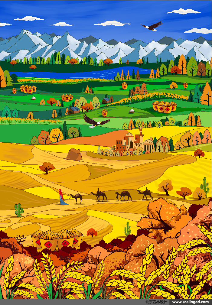 同時(shí)以西域風(fēng)情的地域文化元素(松樹(shù)、草原、沙漠、駱駝、建筑、雪山、果樹(shù))給人原生態(tài)之感。