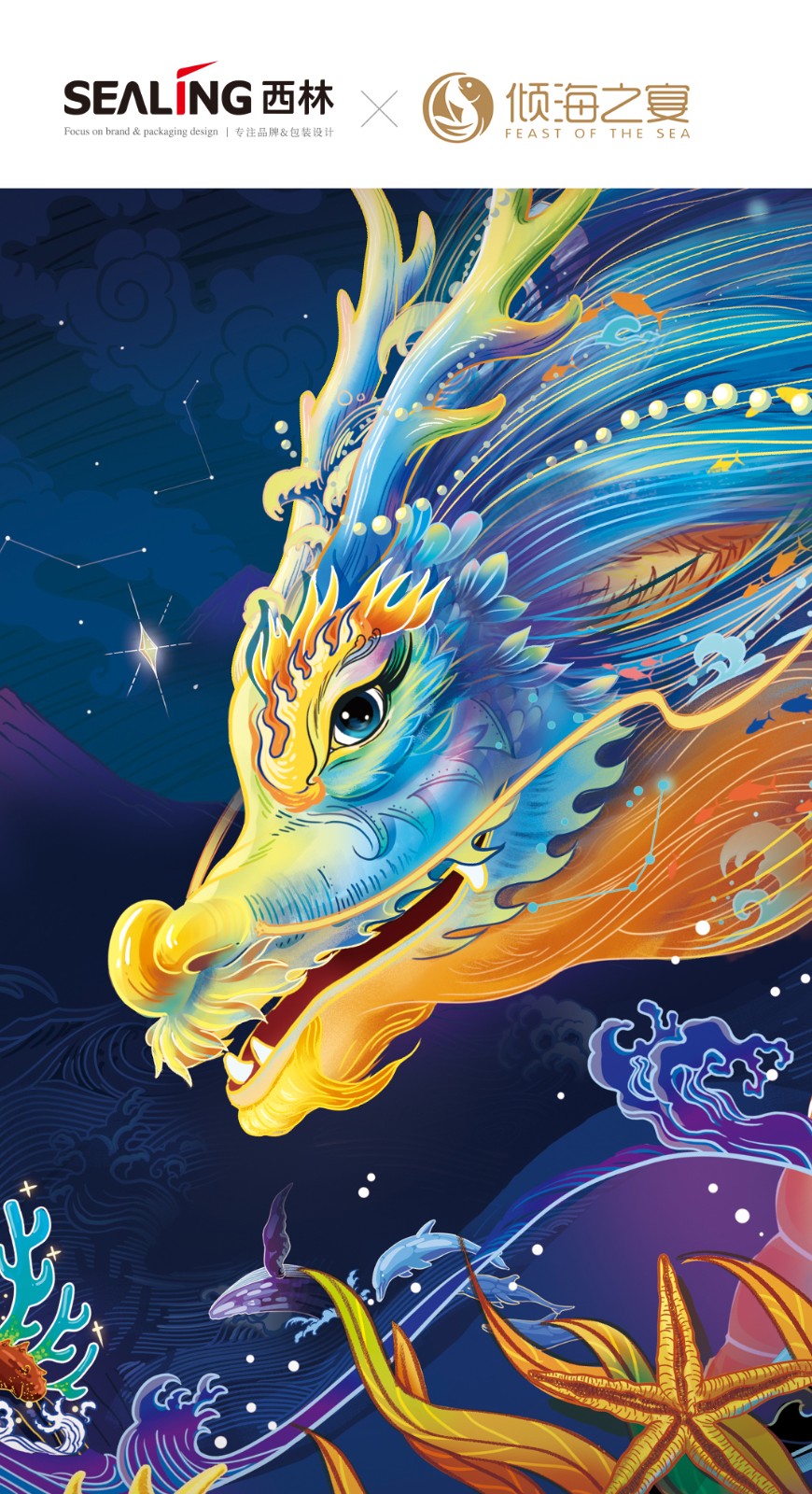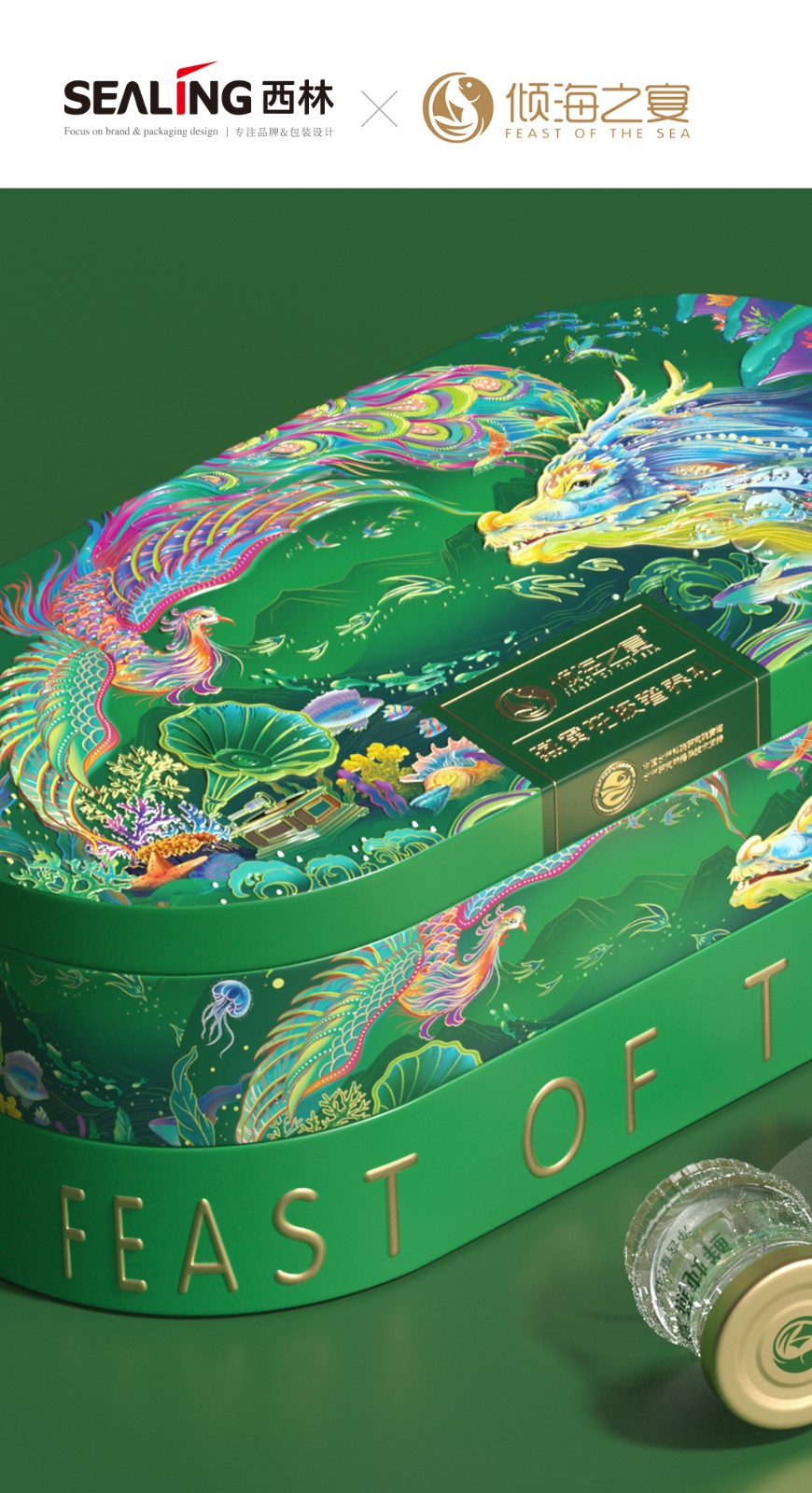 近兩年來(lái),西林設(shè)計(jì)為傾海之宴打造的“傾海龍”超級(jí)符號(hào),被廣泛應(yīng)用在視覺(jué)傳播的種個(gè)節(jié)點(diǎn)上,從產(chǎn)品包裝、宣傳物料、展會(huì)、新品發(fā)布會(huì)等等,形成了良好的視覺(jué)印象,也是傾海之宴禮盒包裝設(shè)計(jì)的核心元素,它不僅具有強(qiáng)烈的視覺(jué)沖擊力,還承載著深厚的文化內(nèi)涵。在設(shè)計(jì)中,龍成為了這一符號(hào)的代表,這一選擇并非偶然。龍,作為中國(guó)傳統(tǒng)文化的象征,代表著力量、尊貴與吉祥,中華人都是龍的傳人。在包裝上使用龍作為超級(jí)符號(hào),能夠迅速吸引消費(fèi)者的眼球,并在情感上產(chǎn)生共鳴。這種情感鏈接有助于增強(qiáng)消費(fèi)者對(duì)產(chǎn)品的好感,從而提高產(chǎn)品的附加值和市場(chǎng)競(jìng)爭(zhēng)力。