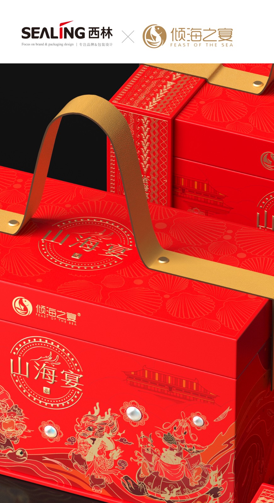 西林設(shè)計(jì)認(rèn)為包裝的功能性和用戶體驗(yàn)也是設(shè)計(jì)價(jià)值的重要體現(xiàn)。傾海之宴的禮盒包裝應(yīng)注重結(jié)構(gòu)穩(wěn)固、開(kāi)盒體驗(yàn)等方面的設(shè)計(jì),以提高用戶體驗(yàn)儀式感。為了強(qiáng)化品牌形象,我們將在禮盒正前方設(shè)計(jì)一個(gè)精致的山海宴禮盒的專屬標(biāo)志。ICON采用立體金標(biāo),與紅色背景形成鮮明對(duì)比,易于識(shí)別。遵循簡(jiǎn)潔大方,既能突顯出品牌特色,又能提升禮盒的整體質(zhì)感,與插畫(huà)空間創(chuàng)意相得益彰。