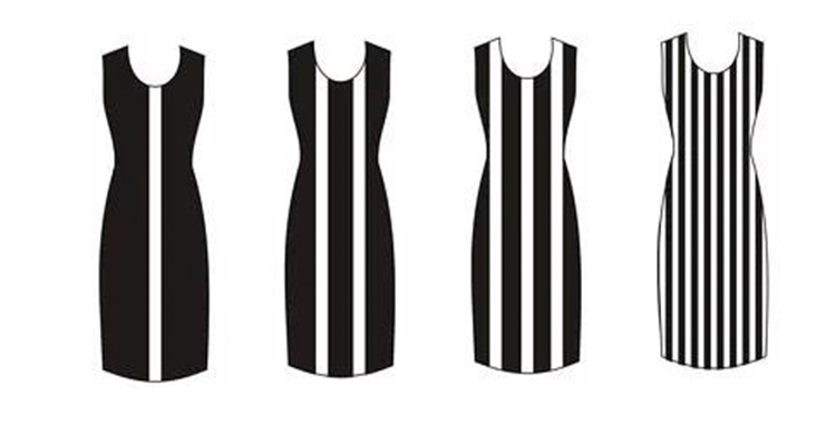 摩爾紋動態(tài)面料應用,在平日里很多愛美的女生喜歡穿條紋長裙,從下圖中可以直觀地感受到,左一最顯瘦,從視覺的寬度上來說,隨著條紋增多,反而越發(fā)有“膨脹感”、“厚重感”。因此,在買條紋裙子的時候,想要穿著顯瘦點,大家可以選條紋大的裙子。