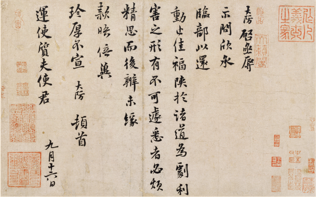 傅堯俞(1024-1091),字欽之,北宋官員,鄆州須城(今山東東平)人。蘇軾謫居黃州時(shí),傅堯俞遣使者來看他并求新近之作,蘇軾親手書寫《赤壁賦》為贈,并在跋中寫道:“軾去歲作此賦,未嘗輕出以示人,見者蓋一二人而已。欽之有使至,求近文,遂親書以寄。多難畏事。欽之愛我,必深藏之不出也,又有《后赤壁賦》筆倦未能寫,當(dāng)候后信。軾白?!薄墩綮厶肥歉祱蛴醾魇滥E孤品,系致友人應(yīng)酬問候的短札。