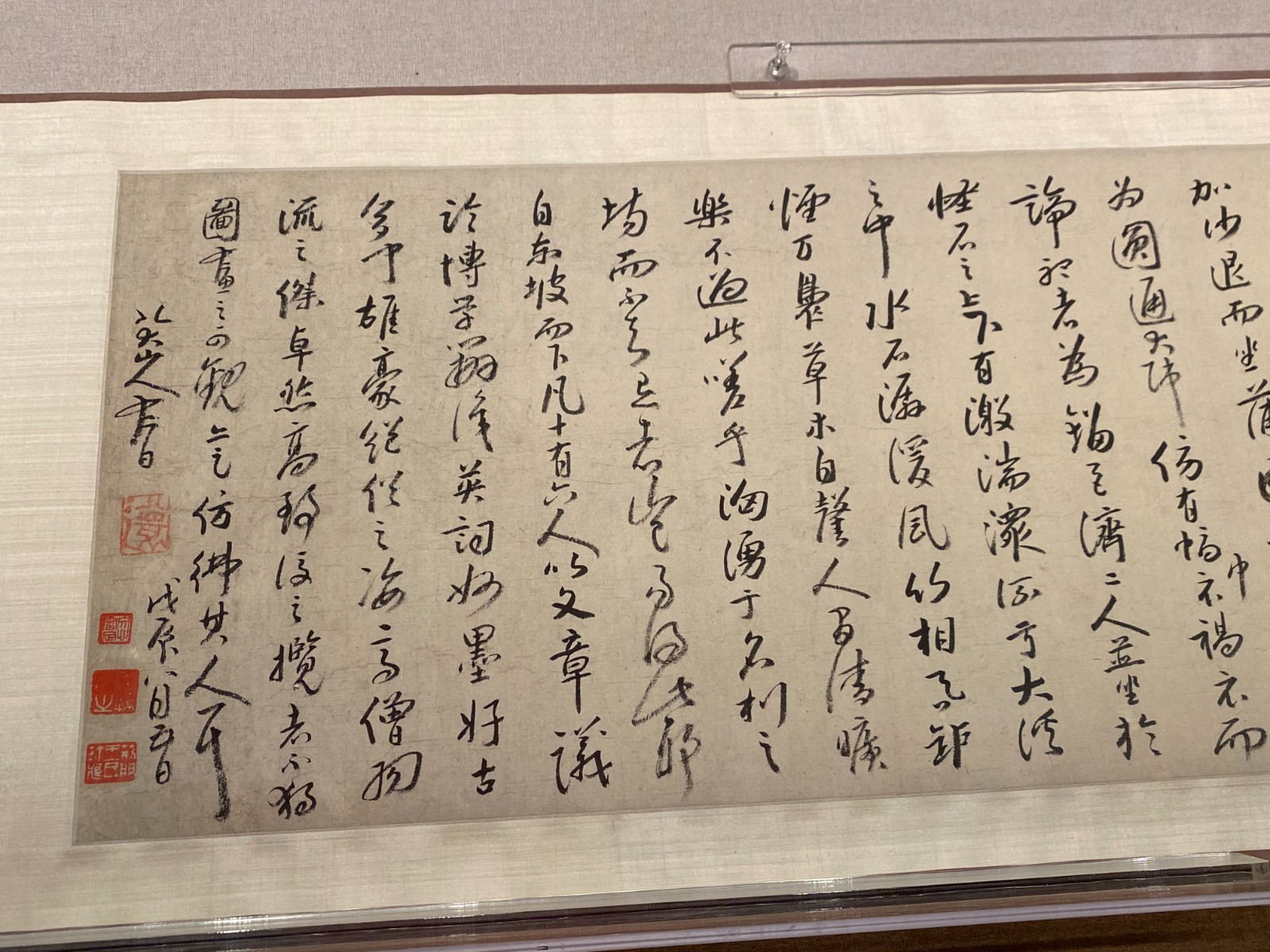 標(biāo)題“千古風(fēng)流人物”從《答謝民師論文》、《姑孰帖》(本次展覽展品)、《前赤壁賦》中集字而來,均為蘇軾本人所書,縱貫畫面、一氣呵成,且與畫作渾然一體。