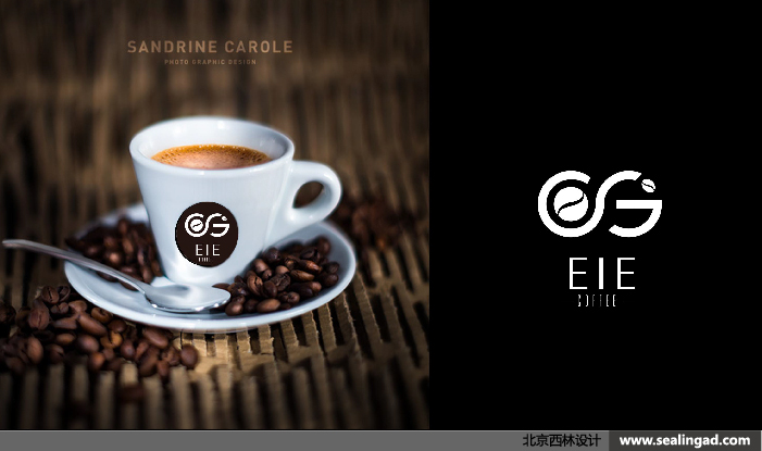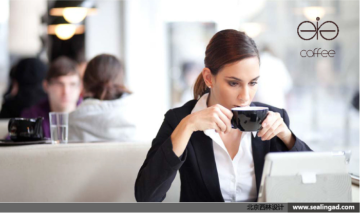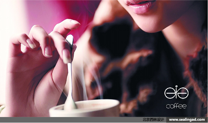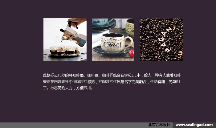 通過一正一倒的兩個(gè)形似咖啡豆的e字,意在美味與他人共分享,中間的i字?jǐn)M人化,寓意我的咖啡。