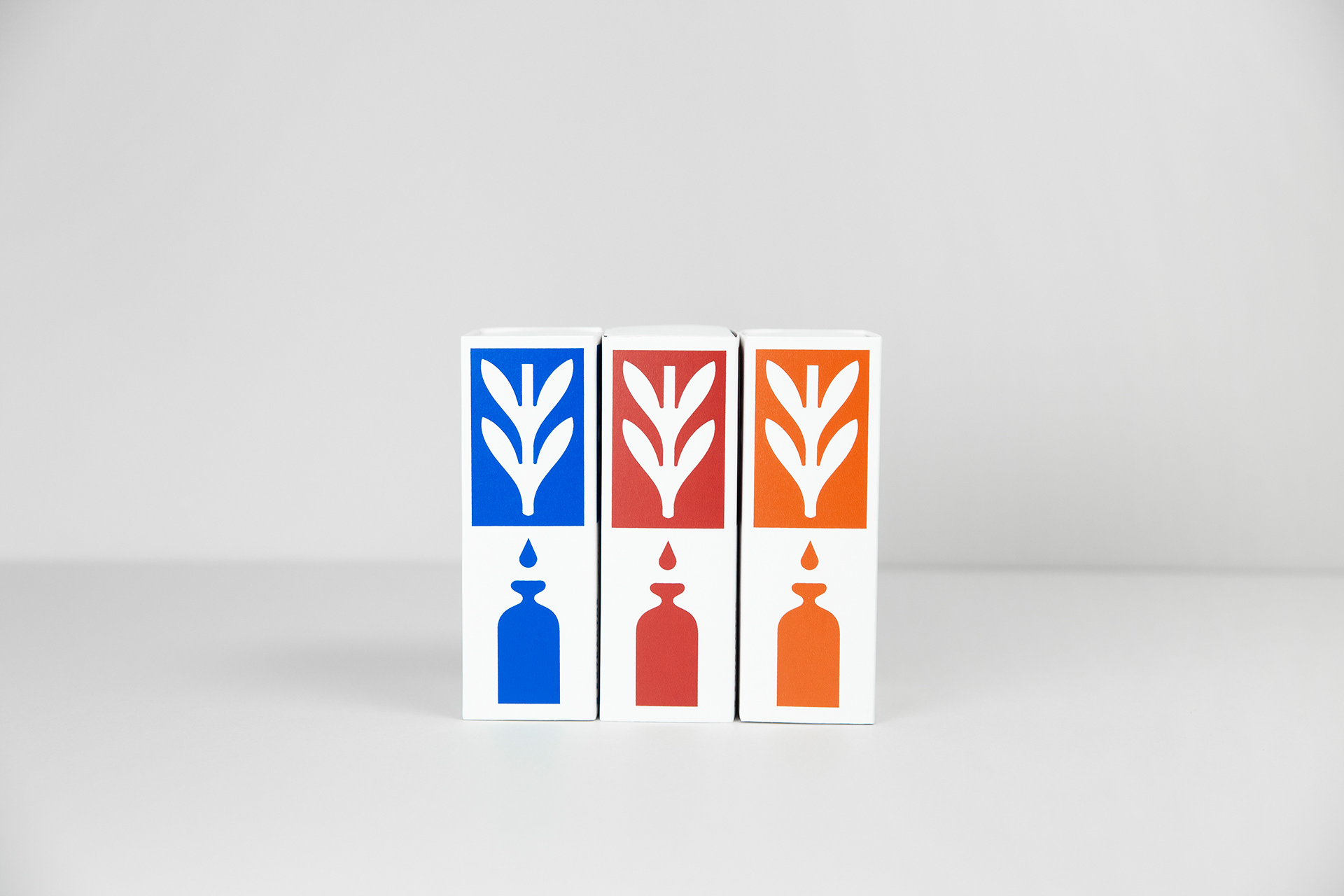 藥用植物浸漬液是含有植物的活性和修復原理的水醇溶液。該產(chǎn)品線由作用于不同身體系統(tǒng)的12種植物組成。每種顏色標識不同的系統(tǒng)。紅色代表循環(huán)系統(tǒng),藍色代表神經(jīng)系統(tǒng),橙色代表消化系統(tǒng)。從包裝的設計出發(fā),我們借鑒了普通藥物的美學并將其與植物世界聯(lián)系起來,從而將重點放在整個項目用1塊絲印絲網(wǎng)印刷。