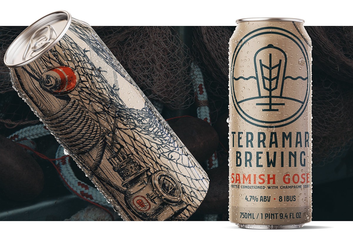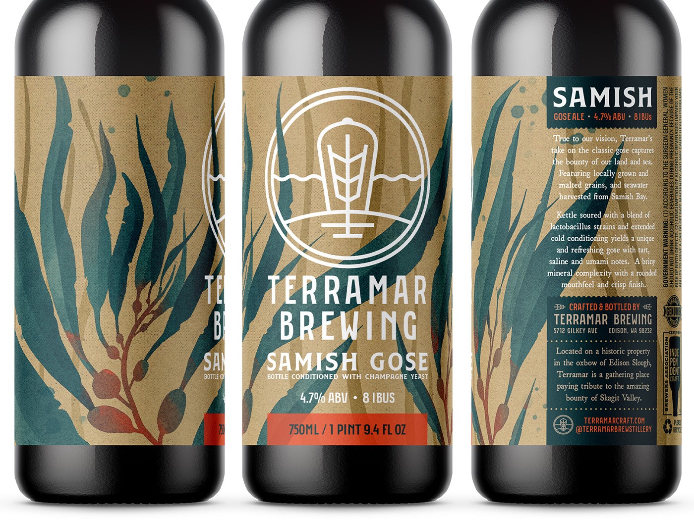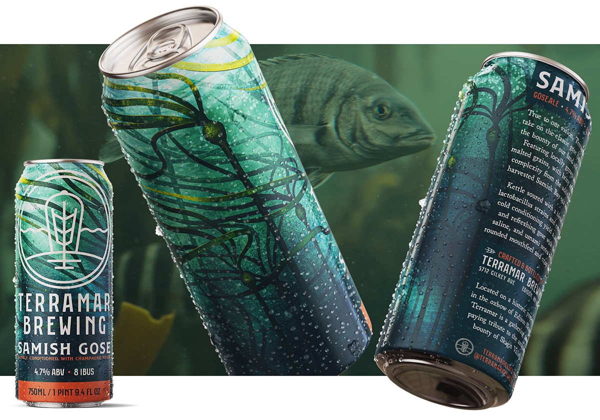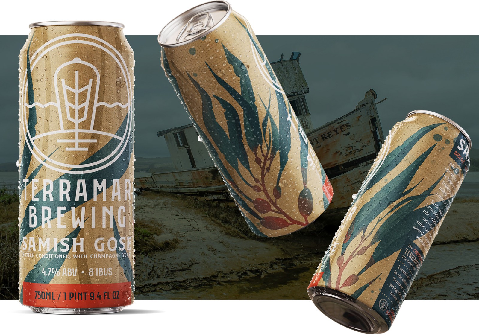 Terramar 的 Samish Gose,一個 750 毫升的瓶子,看看這些設(shè)計如何轉(zhuǎn)化為 16 盎司的罐子,以水彩風格的巨型海帶(sp. Macrocystis pyrifera)的繪畫效果圖為中心