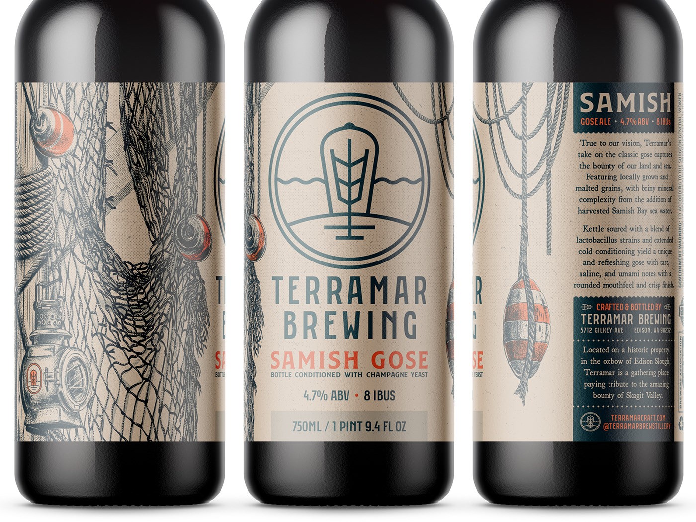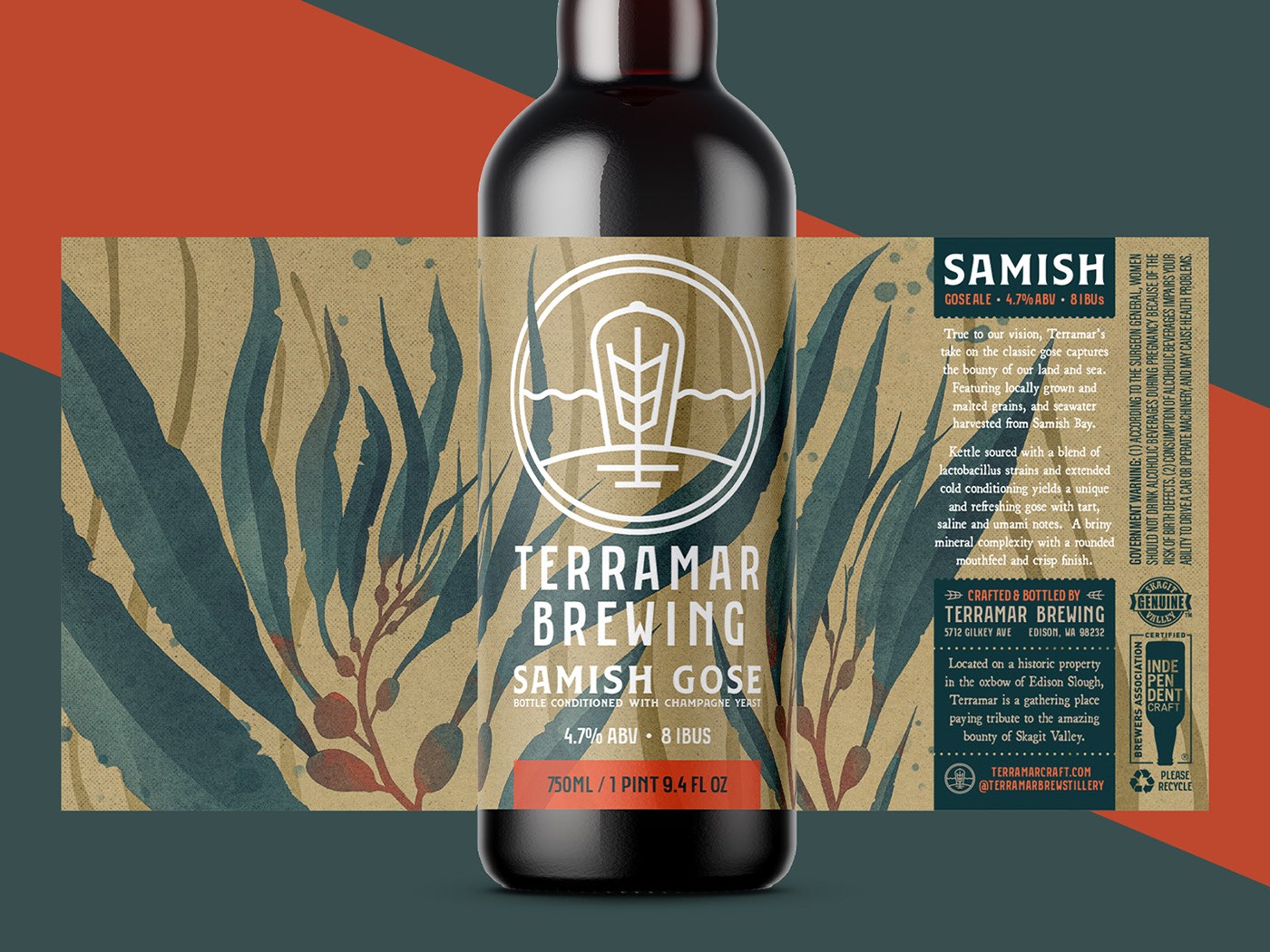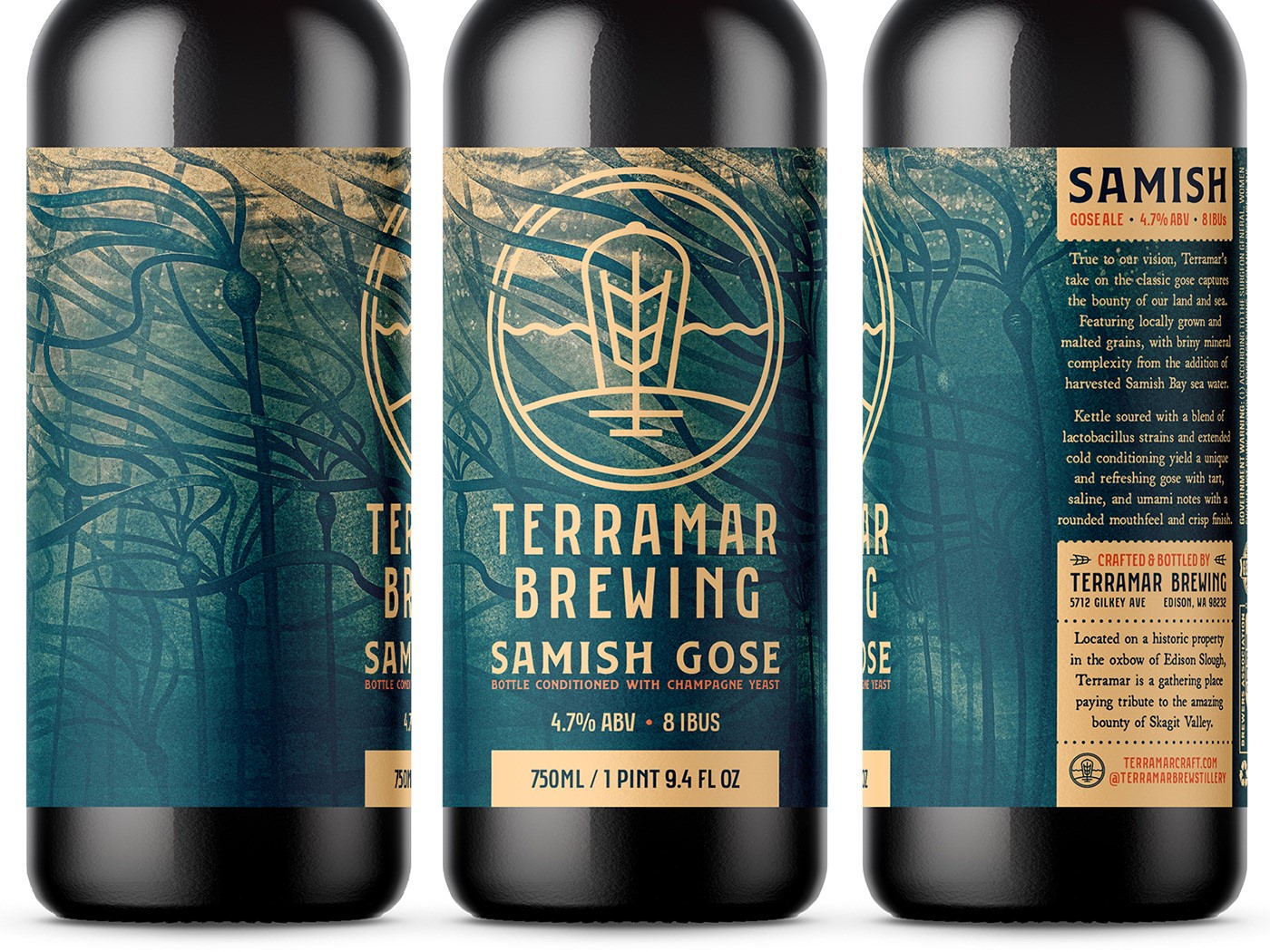 Terramar 的 Samish Gose,一個 750 毫升的瓶子,看看這些設(shè)計如何轉(zhuǎn)化為 16 盎司的罐子,以水彩風格的巨型海帶(sp. Macrocystis pyrifera)的繪畫效果圖為中心