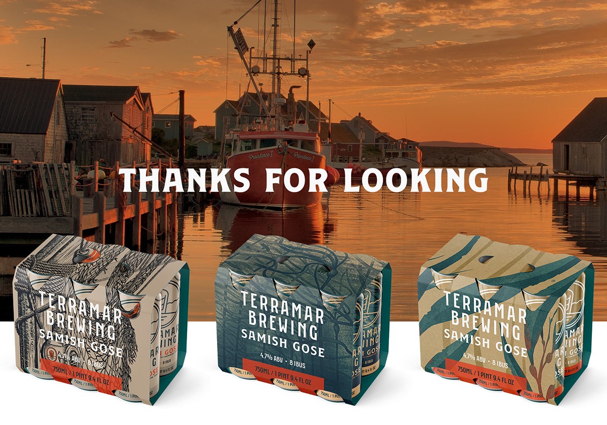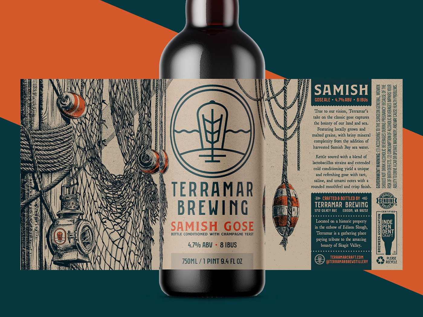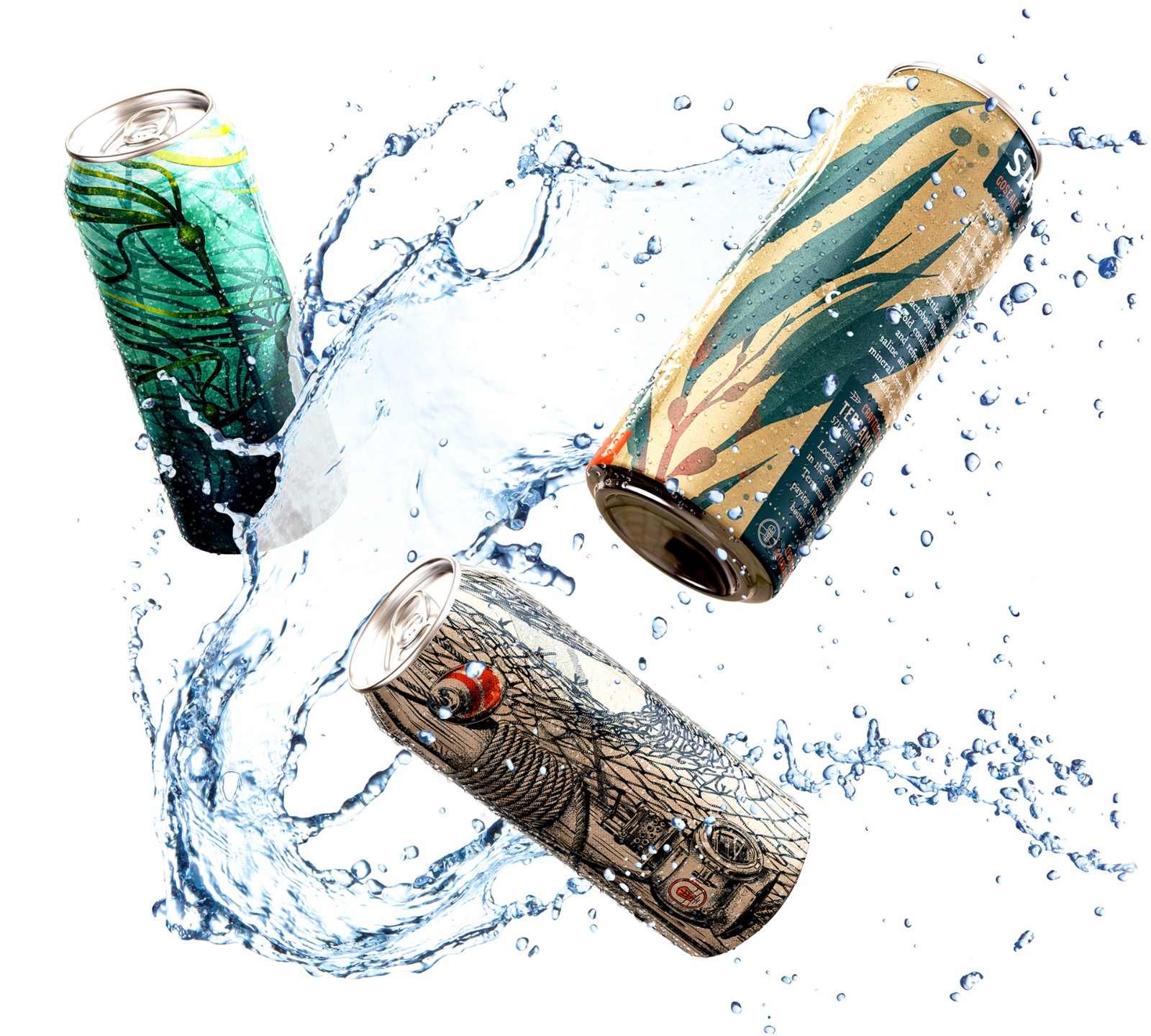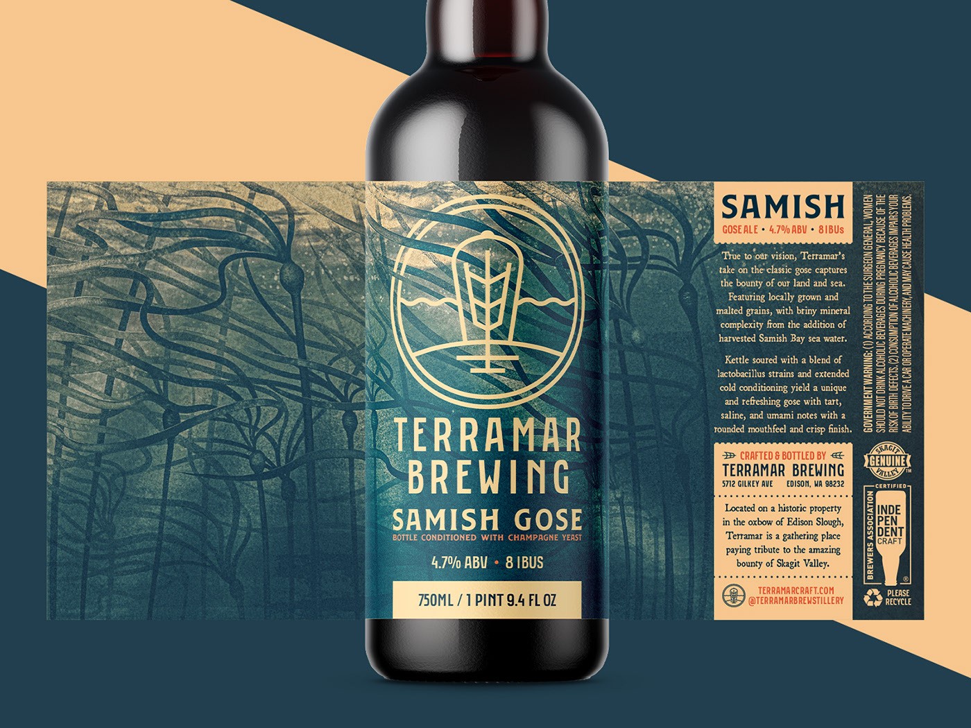 Terramar 的 Samish Gose,一個 750 毫升的瓶子,看看這些設(shè)計如何轉(zhuǎn)化為 16 盎司的罐子,以水彩風格的巨型海帶(sp. Macrocystis pyrifera)的繪畫效果圖為中心