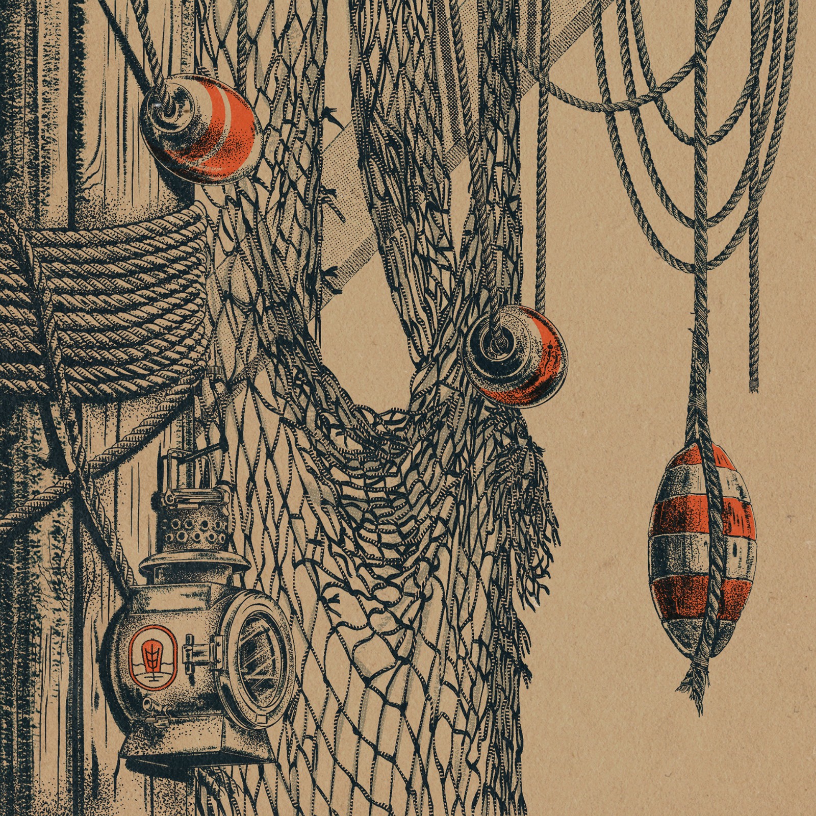 這個概念結(jié)合了漁船索具、燈籠、浮標和漁網(wǎng)的插圖圖像。